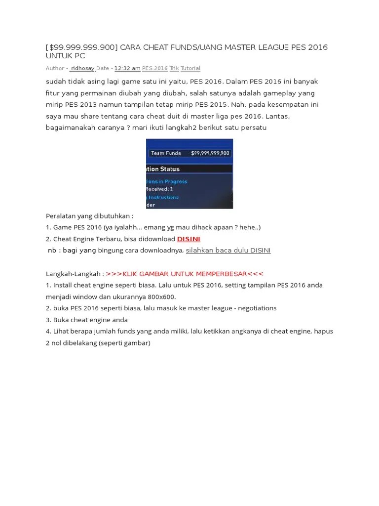Home => menonaktifkan semua fungsi. Pes 2016 master league hack/unlimited money with cheat engine. Cheat become a legend & master league pes 2013 (football life) tony 11:01:00. Allowing to edit player in master league or become a legend game mode. Cheat engine can be downloaded . In the video u will learn how to change the money values in pro evolution soccer 2016 master league.\r \r. Jalankan pes 2016 v1.0 plus 7 trainer; I found this method since pes 2016, by accident + trial & error. Pro evolution soccer 2017 bal. Nah, pada kesempatan ini saya mau share tentang cara cheat duit di master liga pes 2016. Siapkan cheat engine, bila sobat belum punya cheat engine, . Small cheat table for pro evolution soccer 2019. Since pes base game code never change, it's still applied for pes 2021.